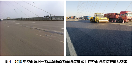 济南黄河三桥是青银高速济南绕城大北环段跨越黄河的一座特大桥,该桥主桥规模在当时同类桥梁中位居世界第二、亚洲第一。原桥面采用环氧沥青混凝土铺装而成,2008年年底通车。2010年东南端桥头桥面铺装出现开裂,泛出锈迹;2011年桥面开裂位置松散和脱落,桥面板裸露,采用进口修复胶进行修复;2012年,修复位置旁又出现大面积脱落和锈蚀,其他部位相继产生了推移、开裂、脱落等损坏。2012年起至今,逐年应用A1型、B型新型高黏沥青进行养护维修,应用至今未产生任何病害,工程成本仅约为原铺装材料的1/3。