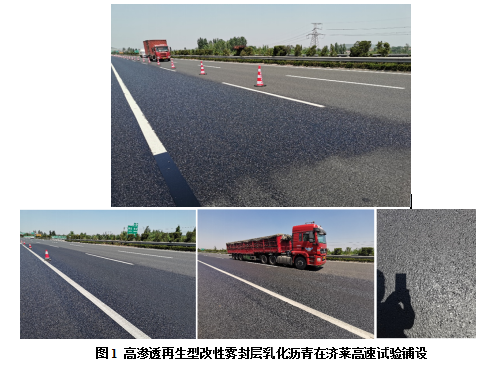 2019年,高渗透再生型改性雾封层乳化沥青在济莱高速K421+300-K422+100处、京台高速万德段K446处、京沪高速K421+300-700处、济南绕城高速大北环项目、顺河高架、微乳路等道路成功铺设试验段,效果良好。